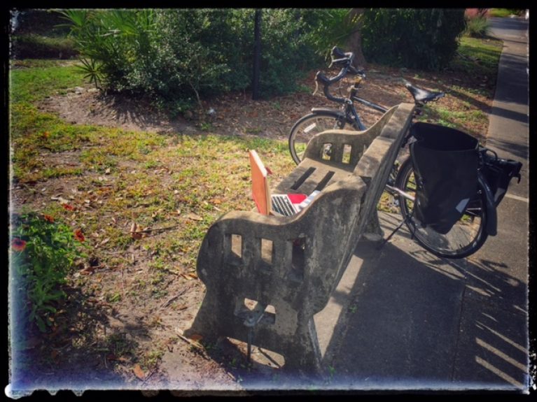 Years prior I caught a glimpse at how one can own time and space by an early morning walk through Piedmont Park in Atlanta. It was a Monday. I know this. Museums are always closed that day and I had to find other diversion before I flew back to Jacksonville. I walked through the park. It was a cold grey morning, no one was about. A distance away I came across a woman lounging on a park bench. She was clad in layers of clothing and a leather jacket. Her back was to one arm rest, while her out stretched legs were propped upon her bag. She was reading a book. Lounging.